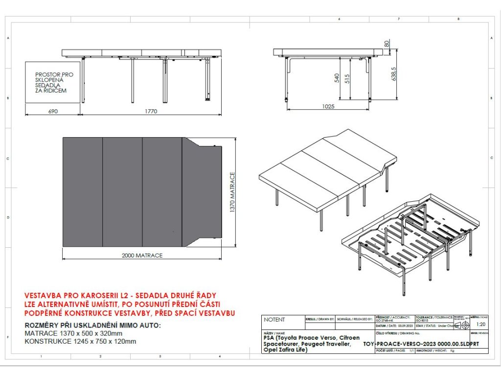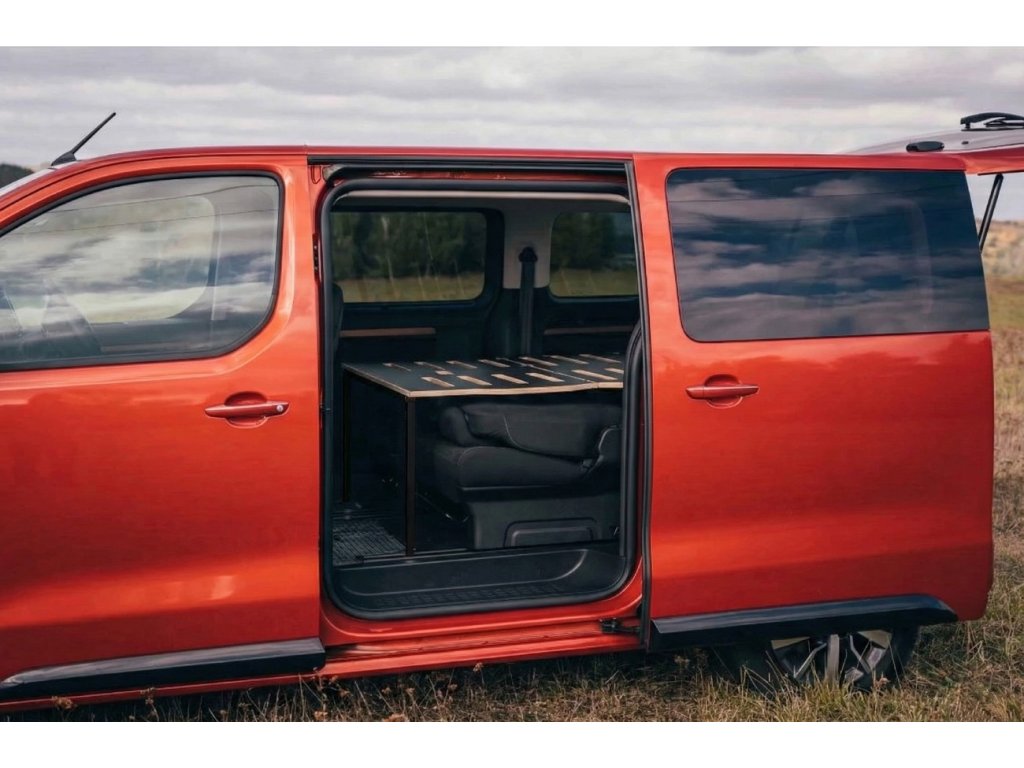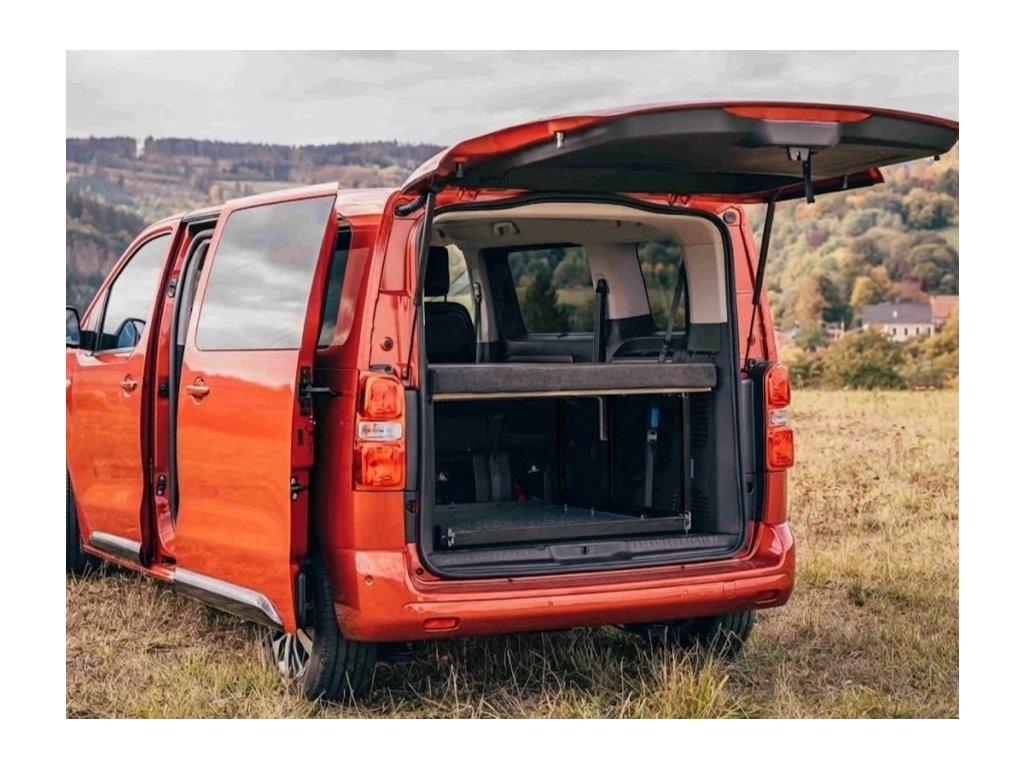 Vestavbu lze převážet úplně složenou v zadní části auta (hloubka konstrukce vestavby 800mm od zadních dveří) nebo polorozloženou za druhou řadou sedadel (hloubka konstrukce vestavby 1280mm od zadních dveří) - rozložení pro spánek je poté do 10 vteřin.